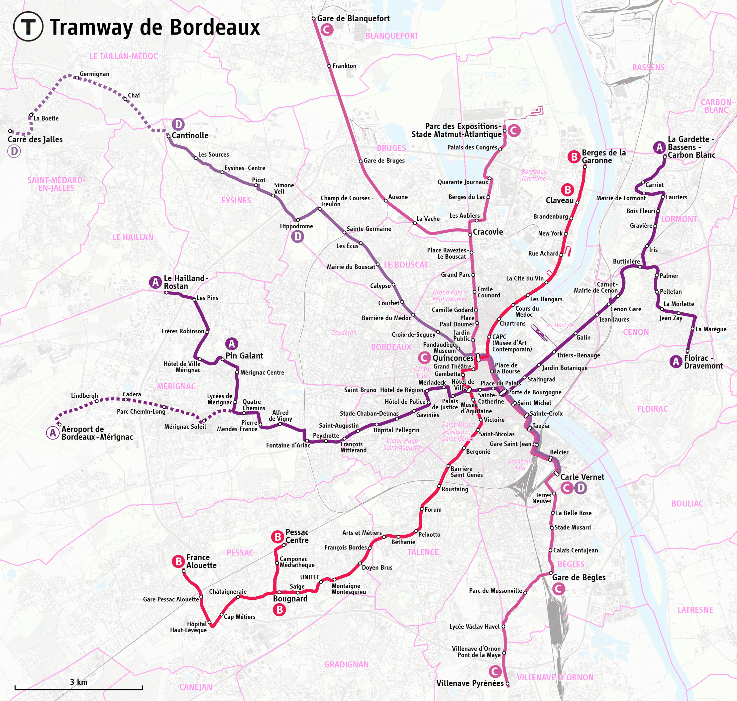 Le système de transport public de Bordeaux, connu sous le nom de TBM (Transports Bordeaux Métropole), vous permettra de vous déplacer confortablement et économiquement dans la ville grâce à quatre lignes de tramway (A, B, C et D), 80 lignes de bus urbains et le service de bateau Bat³.