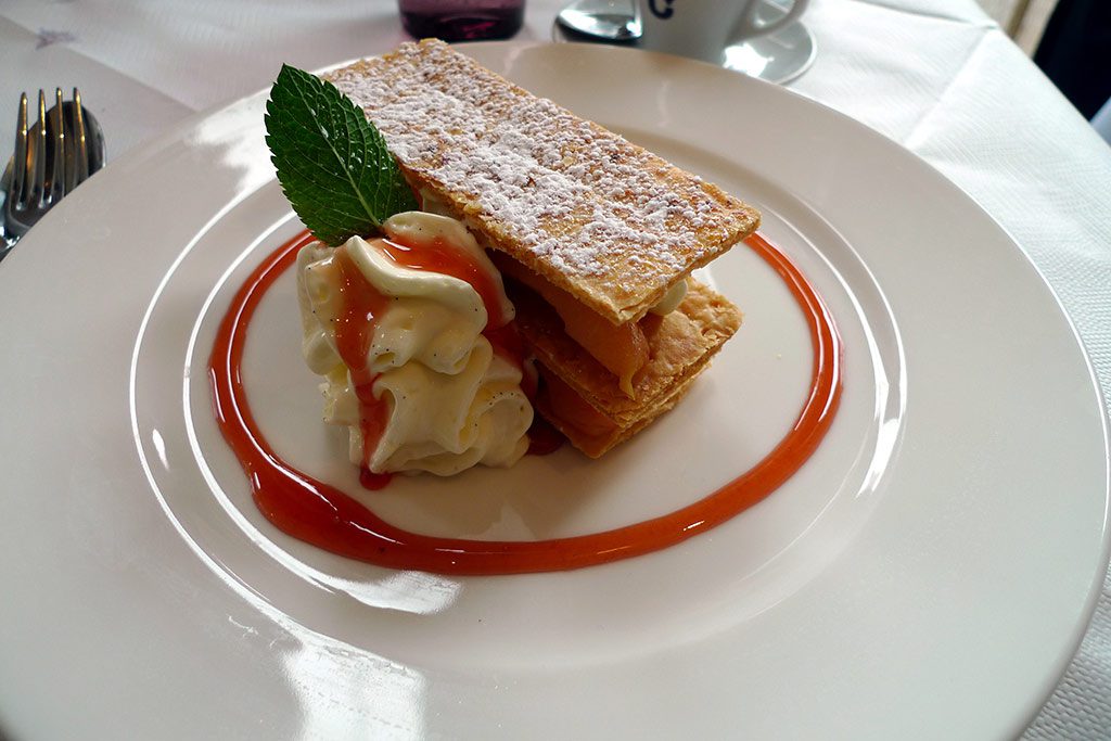 Tout encore une fois me fait envie. Déjà, l’assiette de fromages pouvait en faire baver plus d’un. Mais, je craque pour une petite douceur. Humm ! j’hésite. Enfin, sur l’avis connaisseur du serveur, je choisis une tarte aux pommes ancienne mode. Sucrée à souhait, pâte croustillante, pommes cuites à point, le tout arrosé d’Armagnac, que demander de plus à un dessert ?